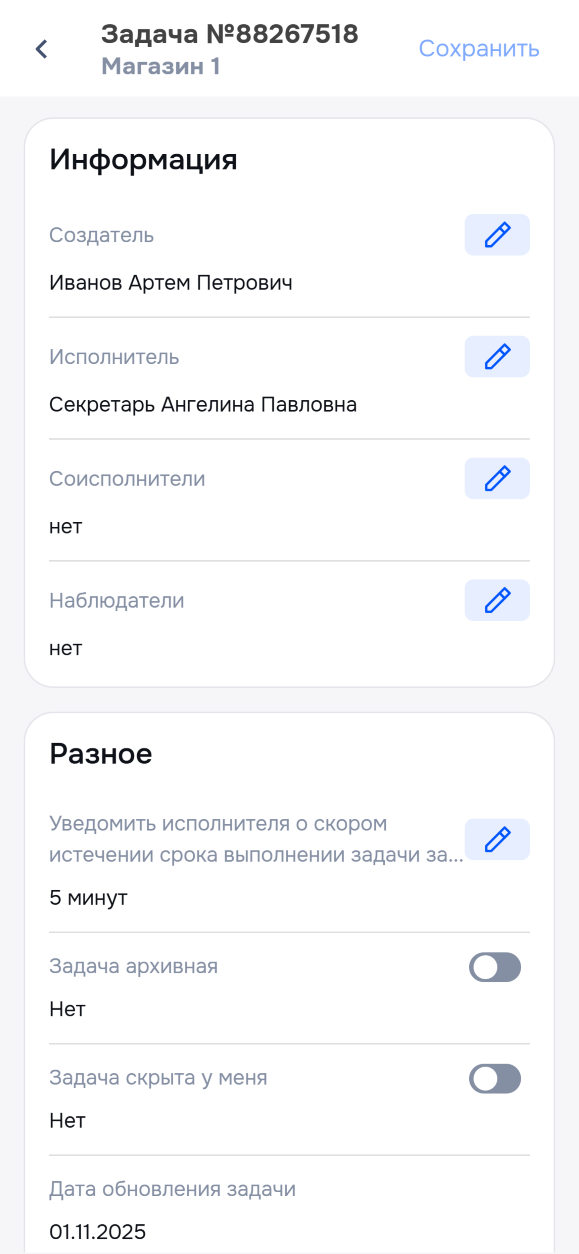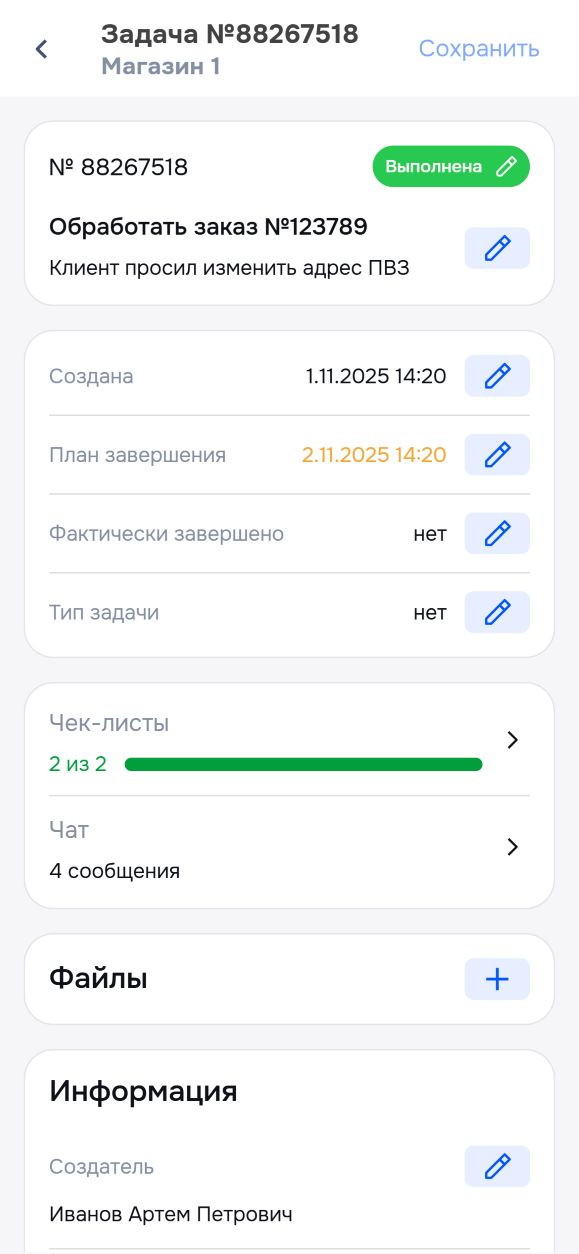 Нажатие на любую задачу в списке переместит вас на отдельную страницу, посвященную выбранной задаче. Здесь вы можете как просматривать, так и корректировать различные поля: