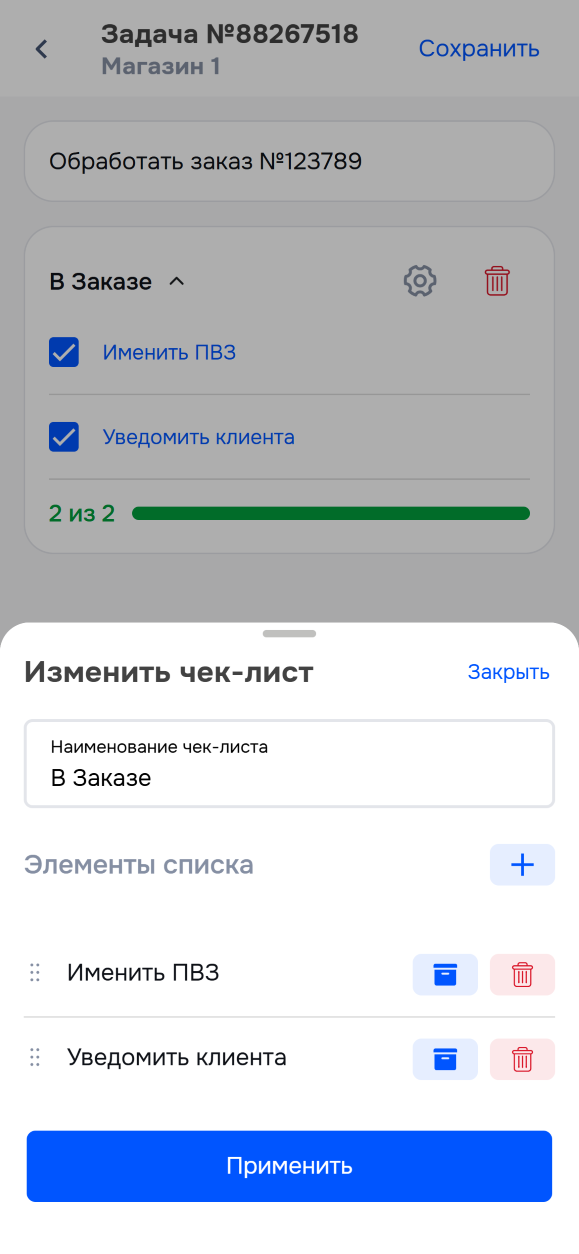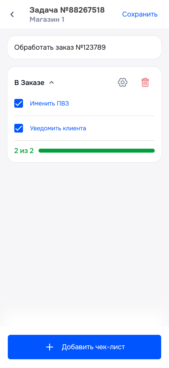 - Если задача комплексная, то она вероятно включает в себя чек-лист, который пользователь должен попунктно отметить выполненным.