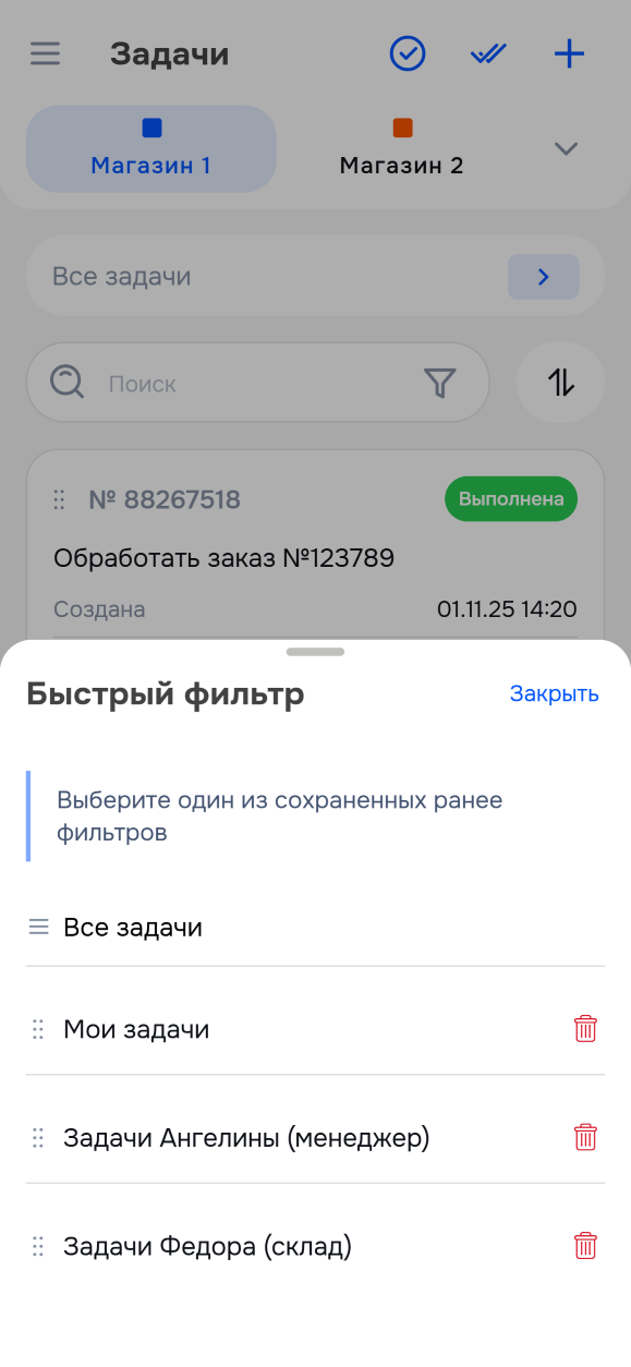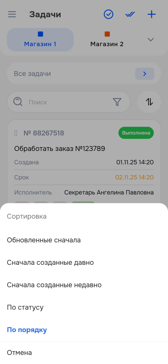 Среди списка значений есть одно особенное значение – это сортировка «по порядку». При выборе этой сортировки, для вас откроется возможность с помощью drag&drop (перетаскивания) менять порядок задач. Так вы можете сперва создать задачи, а потом установить приоритетность, именно в этом порядке увидит задачи выбранный вами исполнитель. Для перемещения задачи, достаточно потянуть ее за специальную иконку в виде точек .