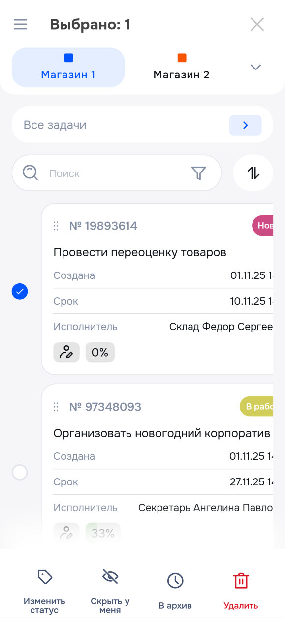 - Поместить задачу в архив (скрыть у всех) / вытащить из архива
